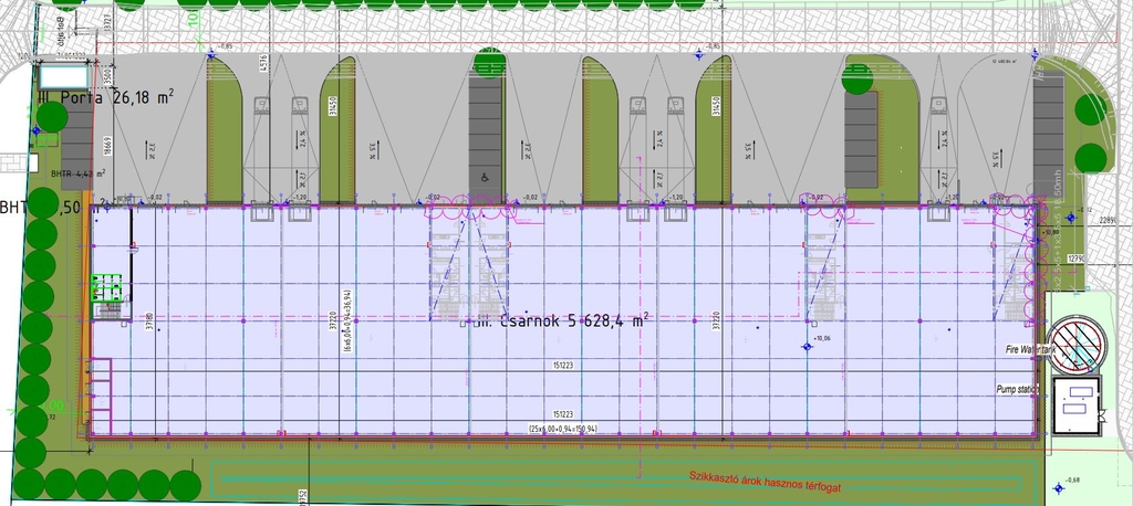 Technikai paraméterek: 5t/nm terhelhetőségű pormentes aljzat, 8m tiszta belmagasság, 18*18-as raszter kiosztás, sötéten sugárzó fűtés, sprinkler, dokkoló kapu/1000nm, drive-in kapu/500nm.