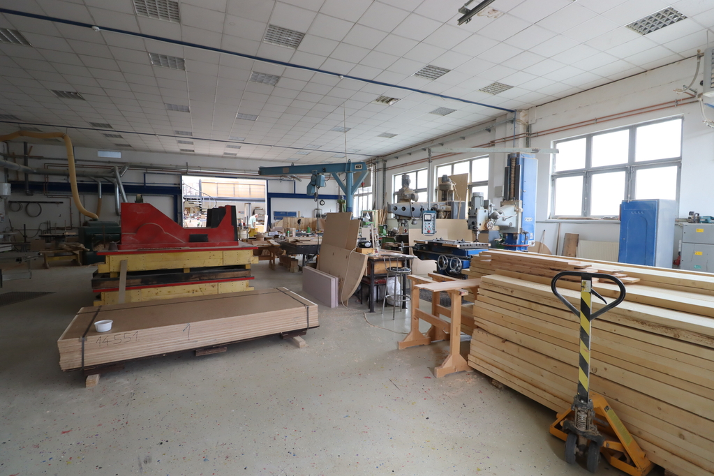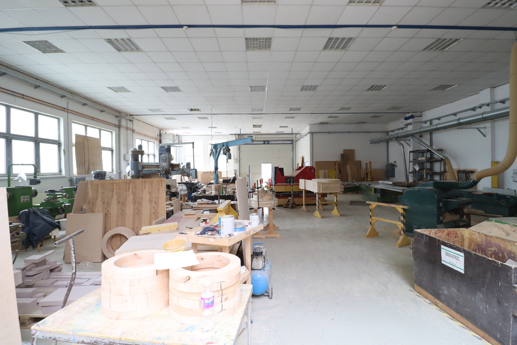 - 500nm-es 4.5m belmagasságú, radiátoros fűtéssel, légkondicionálással ellátott, műgyanta burkolatú, 4.5*3.7m-es szintbeli kapuval, kis galéria irodával, szociális blokkal rendelkező csarnokrész