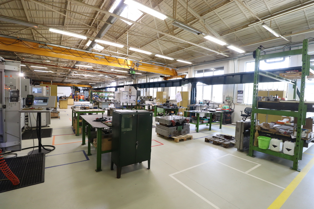 - 980nm-es műgyanta burkolatú 4.4-5m belmagasságú padlófűtéssel fűtött, légkondicionált gyártócsarnok, amelyben 2 db 3.2t-s híddaru található. Kapu mérete: 3.1*3.9m.