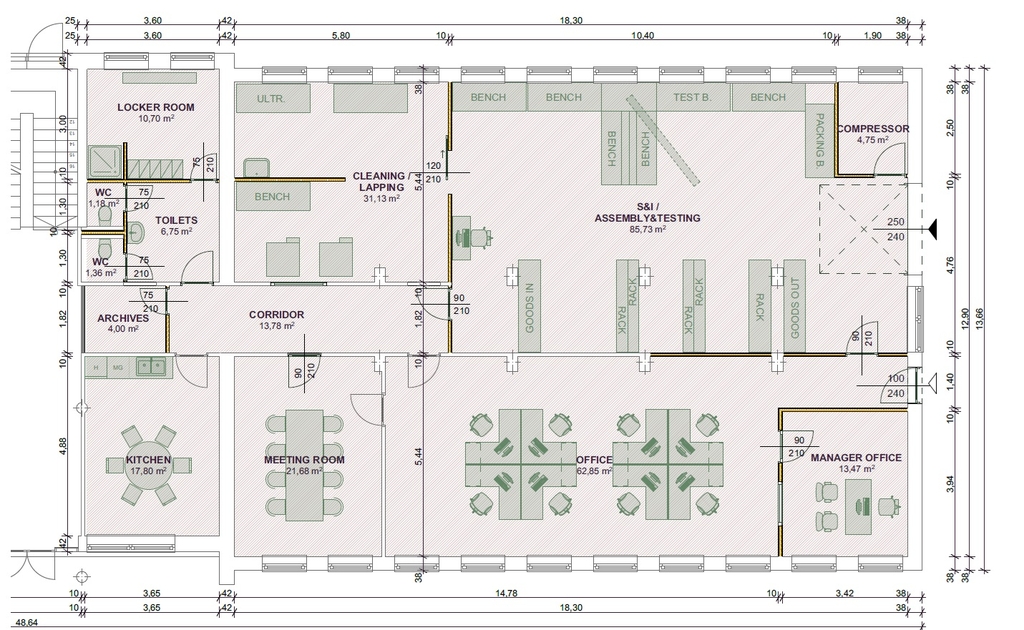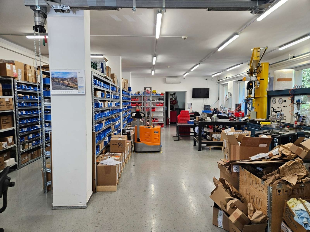- 122nm-es műgyanta burkolatú, fűtött, légkondicionált, szekcionált kapuval ellátot raktár/műhely terület. Belmagasság: 3m.