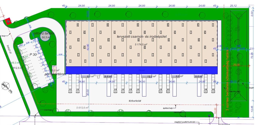 Technikai paraméterek: 7t/nm terhelhetőségű pormentes aljzat, 10m tiszta belmagasság, fűtés, 2 db dokkoló kapu és 1 db drive-in kapu/blokk.